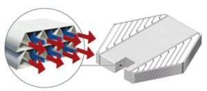 I en motströms värmeväxlare finns ingen fukt eller lukt överföring. Här är från- och tilluftskanalerna helt separerade. Jämför detta med t ex en roterande värmeväxlare som alltid har ett visst internt läckage mellan från- och tilluften. Ett läckage mellan från- och tilluft kan innebära att den förbrukade luften från t ex badrum eller kök till viss del förs in med den nya tilluften vilket kan skapa en viss luktöverföring.